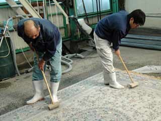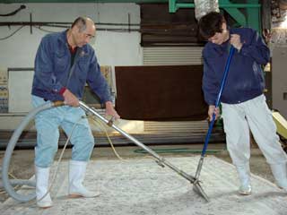 2.大型叩塵機です。まずこの機械でカーペット内部に蓄積したチリやホコリ、ダニやその死骸を叩き出します。この作業は、カーペットクリーニングにとっては、非常に大切なのですが、この作業を行っているのは、当社を含め日本で数社しか有りません。叩塵機にカーペットを通し、ホコリを叩き出します。 |