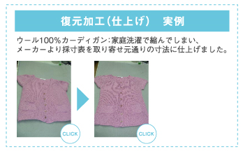 基本は、ドライマークの衣類(ウール・綿・麻・シルク等)をドライクリーニングで、油溶性の汚れを取り除いた後、型くずれ・縮み・風合いの変化等を極力起きないように水やぬるま湯に特殊洗剤を加え手洗いする方法です。また、ウェットしただけでは単純な汗汚れ・食べこぼしのシミ等は落ちますが、頑固なシミは特殊シミ抜きが必要です。